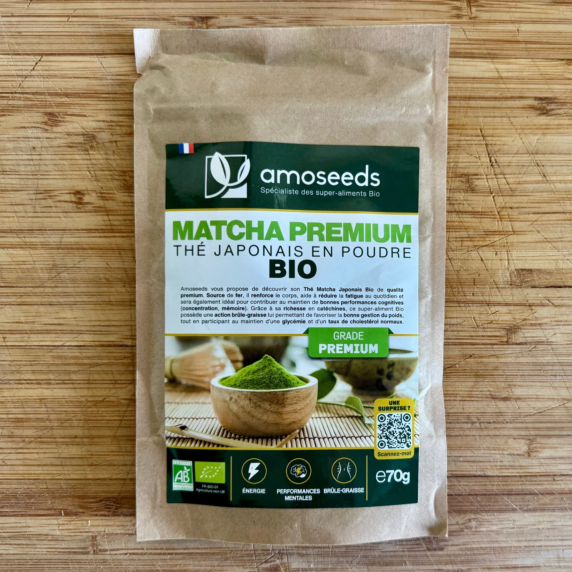Pakke med lækker økologisk, tilsætningsstoffer, konserveringsmiddelfri, GMO-fri matcha te i 70 g. pose.